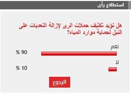 وأيد 90% من القراء مطالب تكثيف حملات الرى لإزالة التعديات على النيل لحماية موارد المياه، بينما عارض 10% من القراء مطالب تكثيف حملات الرى لإزالة التعديات على النيل لحماية موارد المياه.