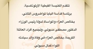 وجاء في البيان الرسمي الصادر عن الكنيسة اليوم الاثنين: "خالص العزاء في وفاة والد اللواء كمال مدبولي. راجين أن يمنحهم الله القدير الصبر والرضا بقضائه".