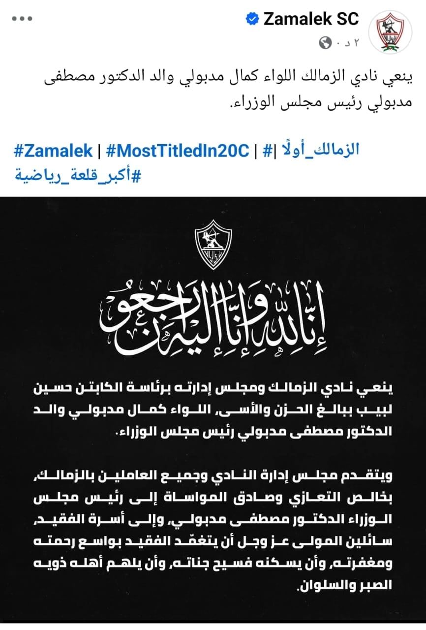 ونشرت الصفحة الرسمية لنادى الزمالك نعيا جاء فيه:" ينعى نادى الزمالك اللواء كمال مدبولى والد الدكتور مصطفى مدبولى رئيس مجلس الوزراء.