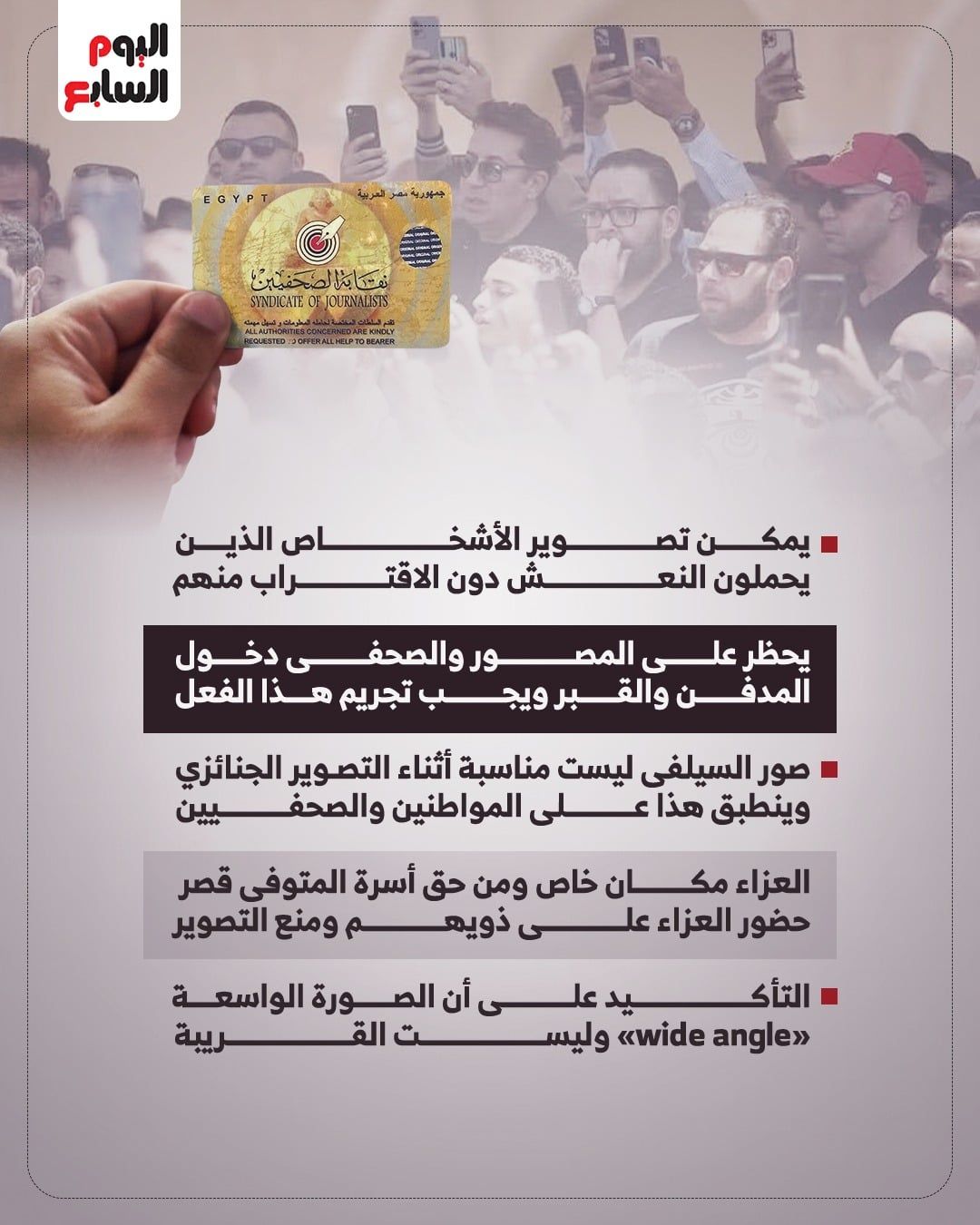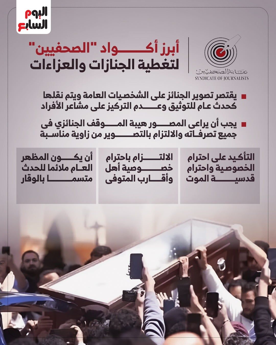 6. الالتزام باحترام خصوصية أهل وأقارب المتوفى، والامتناع عن دفع الميكروفون في وجوههم للحصول على تصريحات صحفية دون موافقتهم.