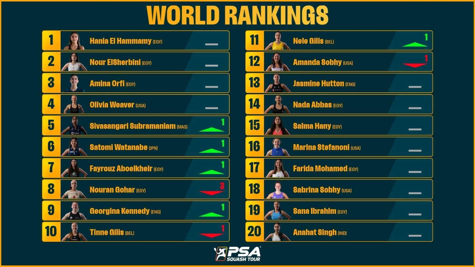 وتراجعت البطلة المصرية نوران جوهر إلى المركز الثامن في جدول الترتيب بعدما كانت في المركز الخامس في التصنيف الماضي، وذلك في ظل غيابها عن المشاركة في البطولات، نظراً لاستقبال مولودتها ليلة خلال الأسبوع الماضي.