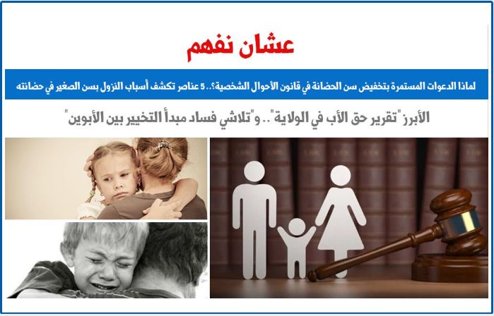 الإثنين، 27 أبريل 2026 04:00 مرصد موقع "برلمانى"، المتخصص في الشأن التشريعى والنيابى، في تقرير له تحت عنوان: " عشان نفهم.. لماذا الدعوات المستمرة بتخفيض سن الحضانة في قانون الأحوال الشخصية؟"، استعرض خلاله 5 عناصر تكشف أسباب النزول بسن الصغير في حضانته، فقد قدم عشرات المتضررين من قانون الأحوال الشخصية شكاوى للجهات المعنية، من خلال تجمعت ودعوات لعودة سن الحضانة لـ7 سنوات، سواء كان على أرض الواقع أو من خلال تجمعات على وسائل التواصل الإجتماعى، يشارك فيها آباء وجدات متضررون من القانون الحالى، وذلك في محاولة للمشاركة في تعديلات قانون الأحوال الشخصية الجديد، وليكون لهم دور ومقترحات في تلك التعديلات.