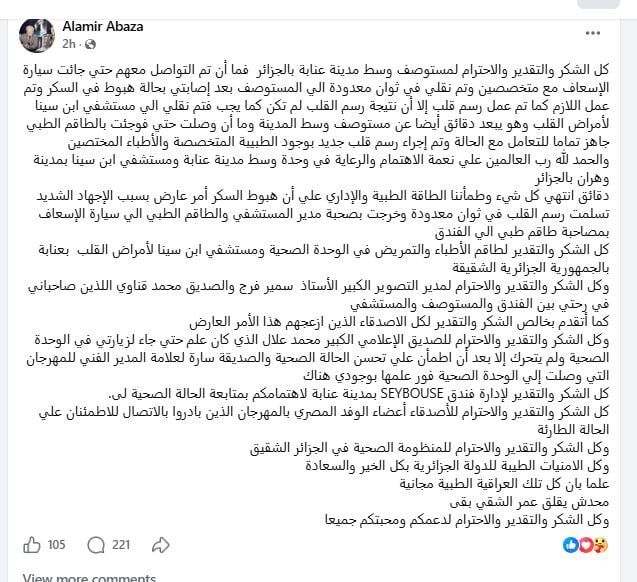 وأستكمل حديثه: "الحمد لله رب العالمين علي نعمة الاهتمام والرعاية في وحدة وسط مدينة عنابة ومستشفي ابن سينا بمدينة وهران بالجزائر، دقائق انتهي كل شيء وطمأننا الطاقة الطبية والإداري علي أن هبوط السكر أمر عارض بسبب الإجهاد الشديد، وتسلمت رسم القلب في ثوان معدودة وخرجت بصحبة مدير المستشفي والطاقم الطبي الي سيارة الإسعاف بمصاحبة طاقم طبي الي الفندق".
