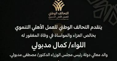 الإثنين، 27 أبريل 2026 08:41 ميتقدم التحالف الوطني للعمل الأهلي التنموي بخالص العزاء والمواساة في وفاة اللواء كمال مدبولي، والد معالي دولة رئيس مجلس الوزراء الدكتور مصطفى مدبولي.