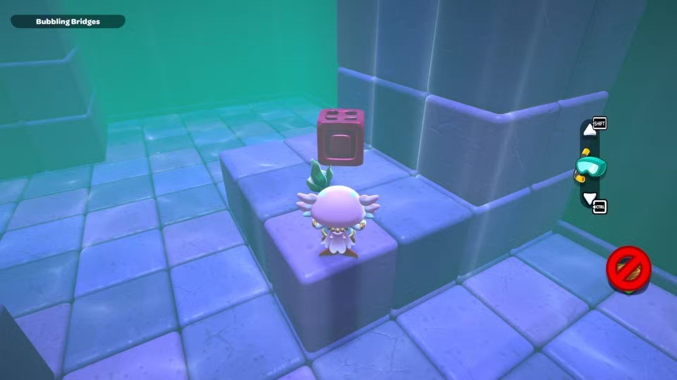 بعد الانتهاء من بناء الجسر، عد إلى منصة البداية وقم برفع مستوى الماء باستخدام الرافعة. بعد ذلك، اغطس في الماء واسبح نحو الجهة اليمنى من الغرفة حتى تصل إلى المكعب الأحمر الموجود في القاع. التقط المكعب، ثم اسبح عائدًا إلى منصة البداية واصعد به عبر الدرج.