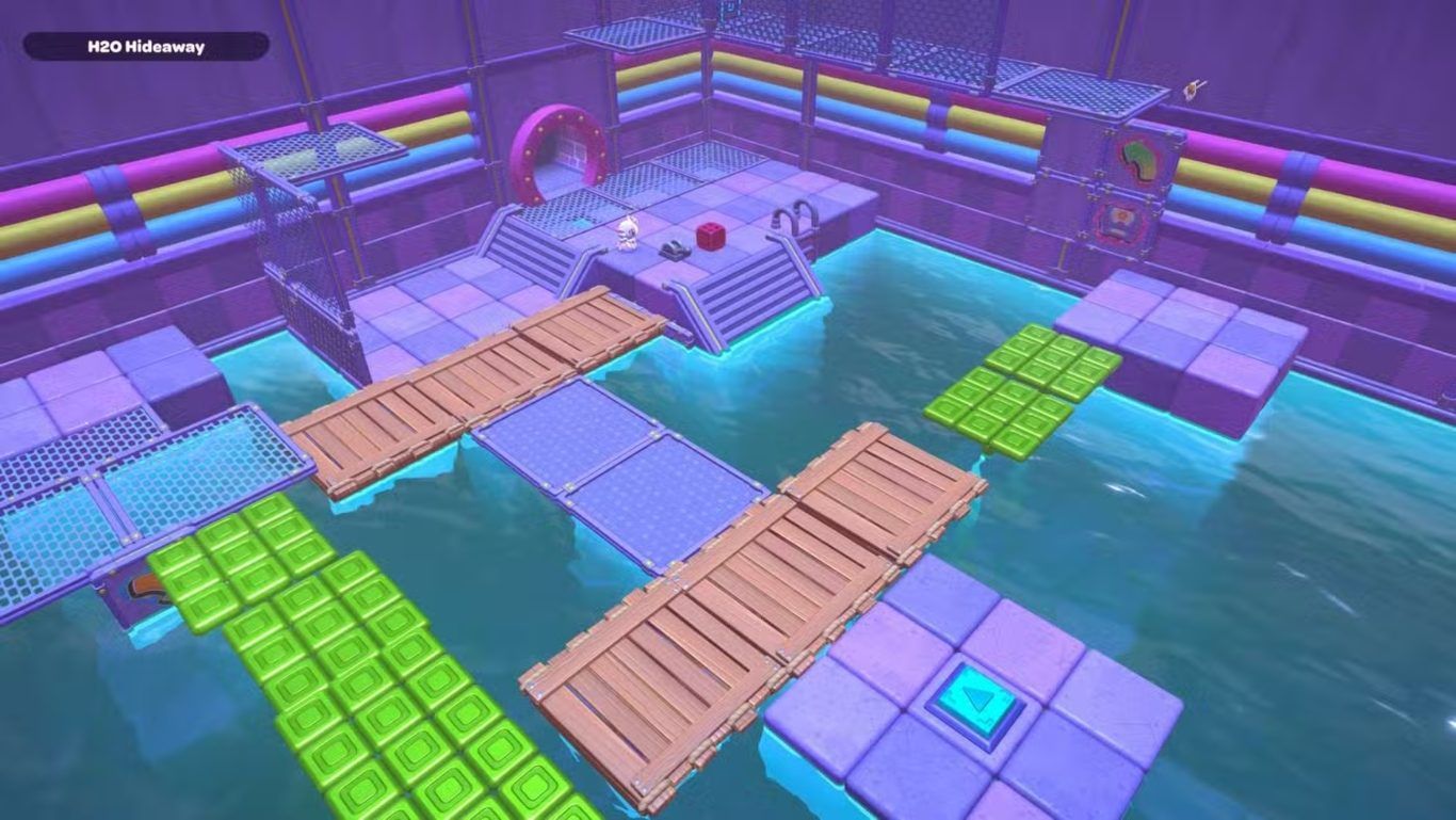 توجّه إلى الرافعة واسحبها حتى يرتفع مستوى الماء. سيتيح لك ذلك الوصول إلى مكعبين أخضرين جديدين. يوجد المكعب الأول على الجهة اليمنى من الغرفة بعد عبور بعض الألواح الخشبية، فالتقطه وضعه مؤقتًا أعلى الدرج. أما المكعب الثاني، فيوجد تحت الماء أمام المنصة التي تحتوي على زر المثلث. اعبر المسار للوصول إلى تلك المنصة، ثم اغطس أمامها لتجد المكعب، والتقطه وضعه بجانب المكعب الأول على الدرج. بعد ذلك، عد إلى الرافعة واسحبها مرة أخرى لخفض مستوى الماء.