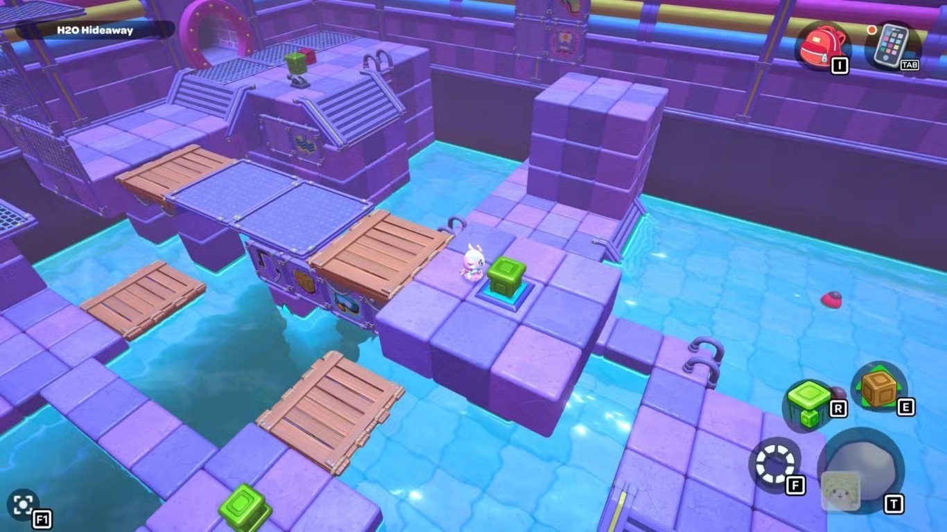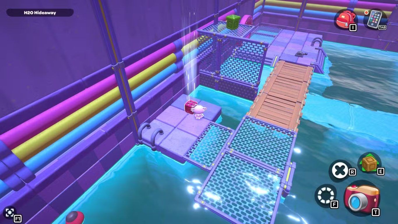 تقع غرفة لغز H2O Hideaway خلف الباب الموجود على الجهة اليمنى في الزاوية الشمالية الشرقية من مجاري City Town. ويتمثل الهدف في هذه الغرفة في الوصول إلى الصندوق الموجود في الزاوية العلوية اليمنى من الغرفة، وهو ما يتطلب استخدام المكعبات والتحكم في مستوى الماء لإنشاء مسار مناسب.