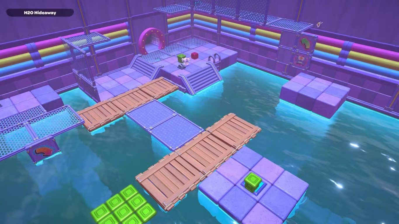 بعد ذلك، خذ المكعبين الأخضرين الموجودين أعلى الدرج وانقلهما إلى زاوية المسار. ستجد هناك مكعبًا أخضر ثابتًا لا يمكن تحريكه. فعّل هذا المكعب أولًا، ثم استخدم المكعبين الآخرين لربط هذه المنصة بالألواح الخشبية الموجودة على جانبيها.