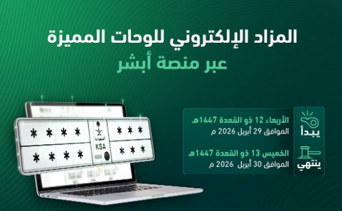 وأشار «المرور السعودي» عبر حسابه بمنصة التواصل الاجتماعي «إكس»، إلى أن «المزاد يتم طرحه عبر منصة أبشر التي تمكّن الراغبين في شراء اللوحات المميزة من المشاركة في المزاد إلكترونيًا».