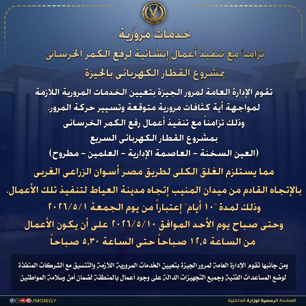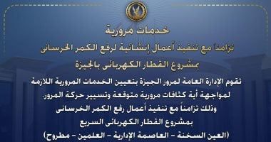 الأربعاء، 29 أبريل 2026 09:20 صأعلنت الإدارة العامة لمرور الجيزة عن اتخاذ إجراءات مرورية استثنائية لمواجهة الكثافات المتوقعة، تزامناً مع بدء مرحلة هامة من أعمال مشروع "القطار الكهربائي السريع" (العين السخنة - العلمين - مطروح)، حيث سيتم البدء في رفع الكمر الخرساني للمشروع العملاق، مما يترتب عليه تغييرات في حركة السير بطريق مصر أسوان الزراعي الغربي.