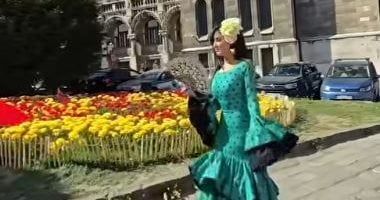 ارتدت مي عمر أزياء أوروبية كلاسيكية تعود لزمن سابق باللون الأخضر ووردة كبيرة صفراء على الشعر ما يدل خلال قيامها بالمشي في أحد شوارع مدينة بودابست بالمجر.