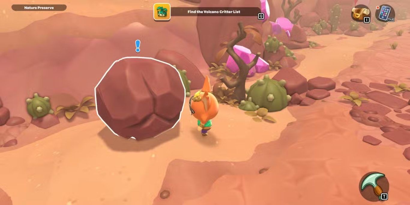 بعد حصولك على Pickaxe، ارجع إلى منطقة Mountain داخل Preserve، وهي المنطقة المرتبطة بالبيئة الجبلية ضمن Nature Preserve. إذا كنت تقوم بتتبع مهمة Volcano Critter List، فسيقوم Guiding Light بإرشادك مباشرة إلى موقعها، والذي يقع أعلى ويسار مدخل هذا القسم من Preserve، مما يسهل عليك الوصول دون الحاجة إلى البحث العشوائي.