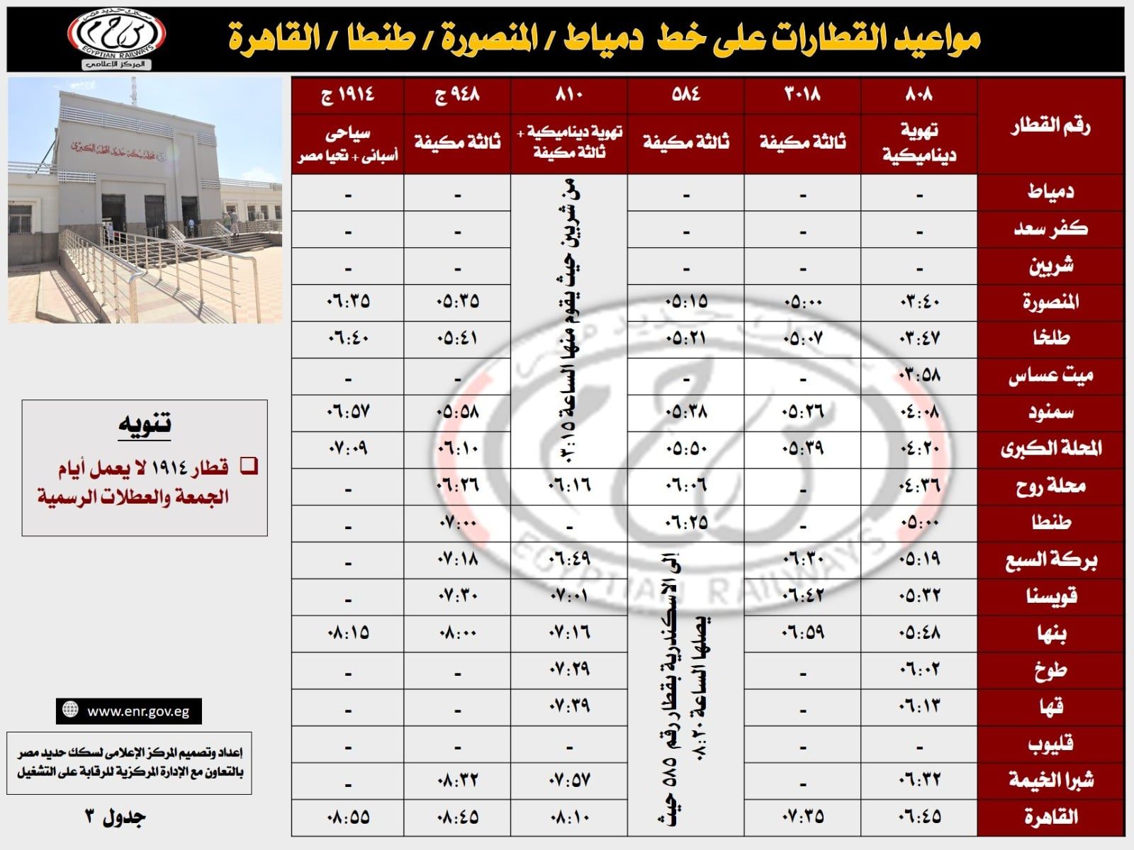 الخميس، 30 أبريل 2026 11:00 صأعلنت الهيئة عن الجداول الكاملة لتشغيل القطارات على خط (القاهرة / طنطا / المنصورة / دمياط) والعودة، وتأتي هذه الخطوة لضمان اطلاع المسافرين على المواعيد الرسمية وتسهيل حركة التنقل بين محافظات الدلتا والقاهرة، وذلك في إطار الاستراتيجية الشاملة التي تتبناها الهيئة القومية لسكك حديد مصر لتطوير منظومة النقل وتقديم خدمات تليق بجمهور الركاب .
