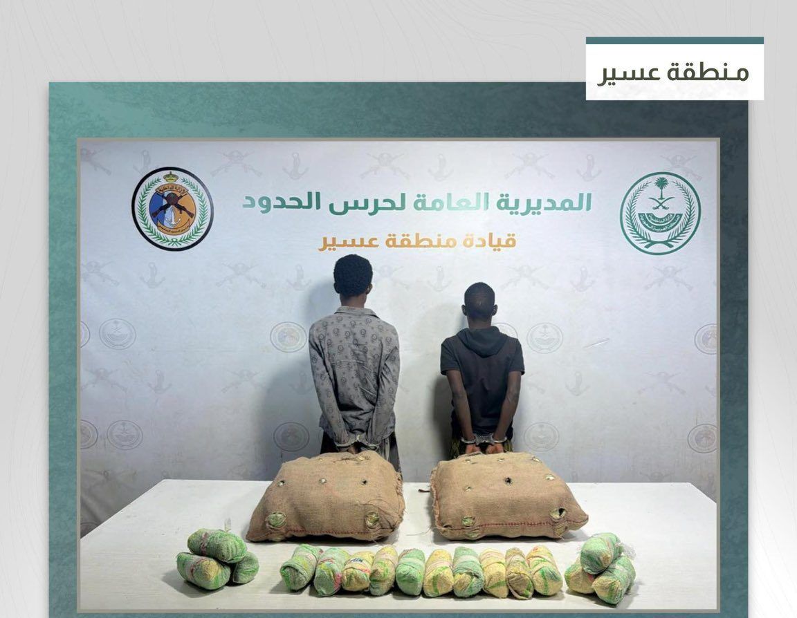 قبضت الدوريات البرية لحرس الحدود في قطاع الربوعة بمنطقة عسير على مخالفين لنظام أمن الحدود من الجنسية الإثيوبية، لتهريبهما (30) كيلوجراما من القات المخدر.