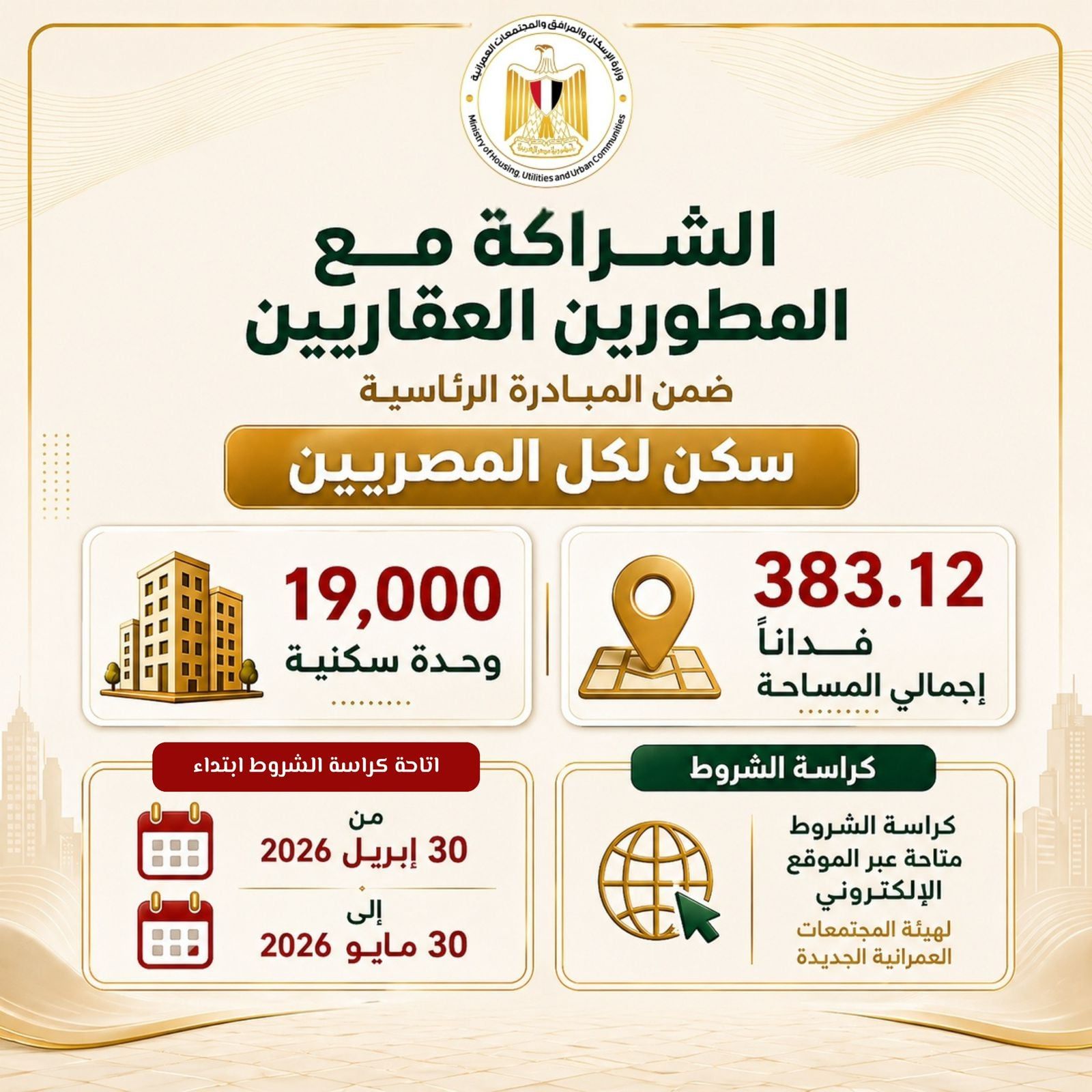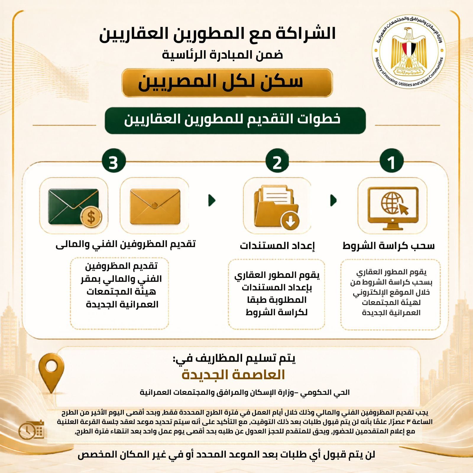 ومن المقرر أن تستمر فترة تقديم الشركات العقارية لمدة شهر، اعتبارا من اليوم وحتي يوم 30 مايو، ويتم تقديم المظروف الفني والمالي .