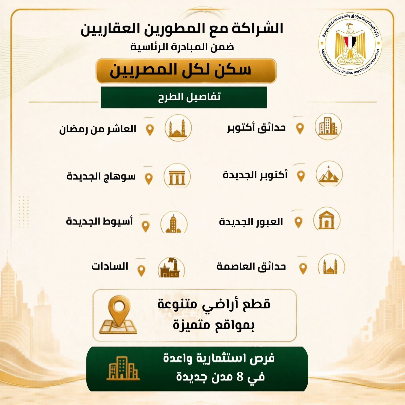 أعدت وزارة الإسكان والمرافق والمجتمعات العمرانية، إنفوجراف حول طرق التقديم على الأراضى التي أعلنت عنها الوزارة في إطارة مبادرة إشراك القطاع الخاص لتنفيذ وحدات سكنية لمحدود الدخل، ضمن برنامج سكن لكل المصريين.