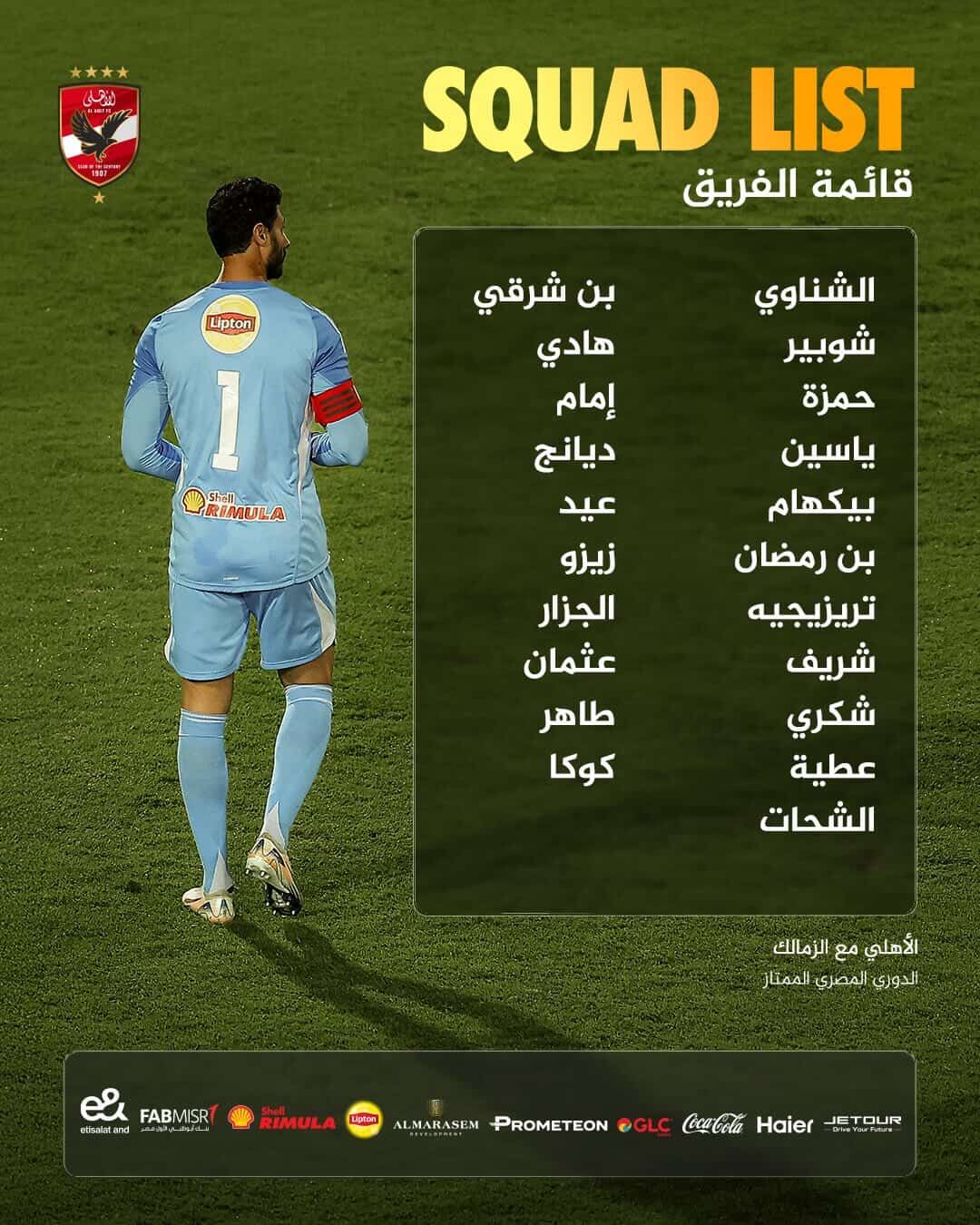 وشهدت القائمة استبعاد ياسر إبراهيم بسبب الإصابة وضم أحمد زيزو رغم الأنباء التي تداولت خلال الساعات الماضة بشأن إصابته.